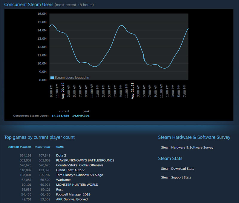 Coba saja kita lihat data Steam Stats saat artikel ini ditulis alias 21 Agustus 2019, 14 juta lebih pengguna Steam aktif bersamaan; dan 100 gim terpopuler termasuk DOTA 2 dan PUBG hanya menampung sekitar 3.469.801 dari mereka. Ke mana sisanya? Rasanya seperti saya saja, apakah saya main Monster Hunter: World sambil menggarap artikel ini berbarengan? Jelas tidak.